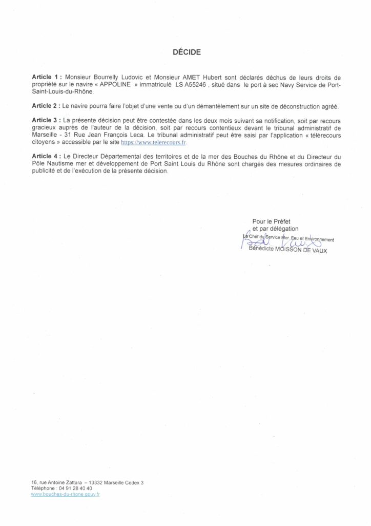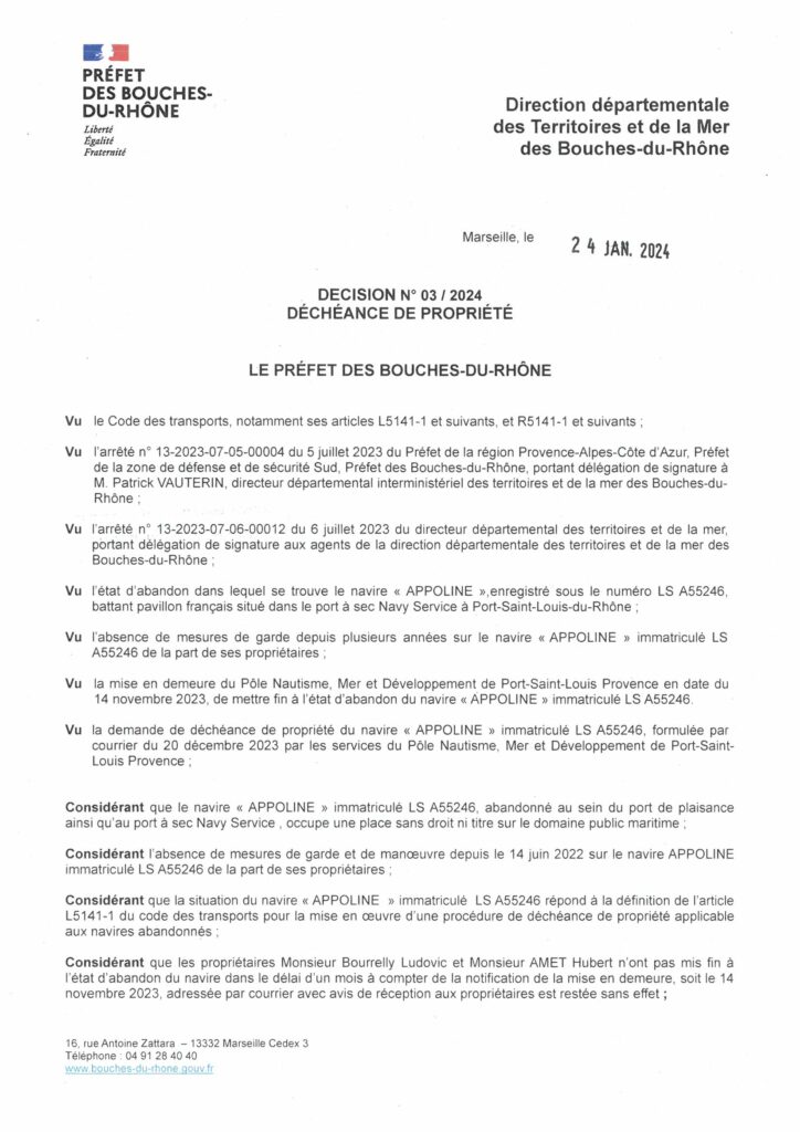 Veuillez trouver ci-dessous l’avis de décision préfectorale de déchéance de propriété, affichée à la Capitainerie du port de plaisance centrale de Port-Saint-Louis-du-Rhône et sur le navire :
