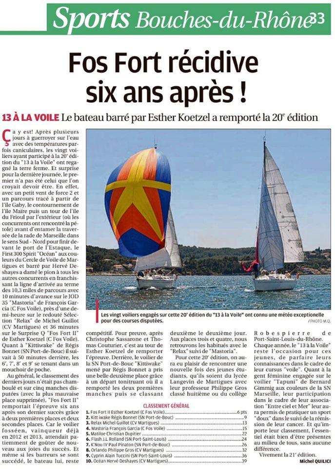 A l’issue de quatre régates, les deux équipages, sur les bateaux Canopus et Evasion ont terminé treizième et seizième sur vingt bateaux. Une jolie performance qui clôt l’année pour ces élèves de l’association sportive du collège, fréquentant chaque semaine la base nautique de Port-Saint-Louis-du-Rhône et profitant des conseils de Fabrice Bourgeois, chef de base, et Rémy Lamour, chef de base adjoint.