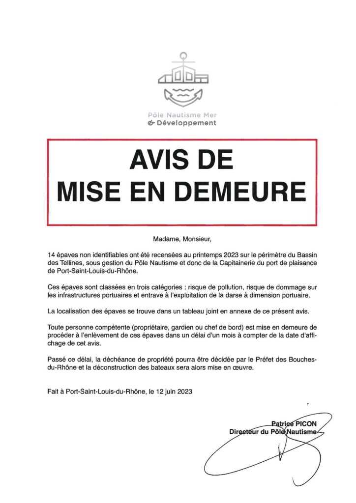 BASSIN DES TELLINES – MISE EN DEMEURE - Pôle Nautisme