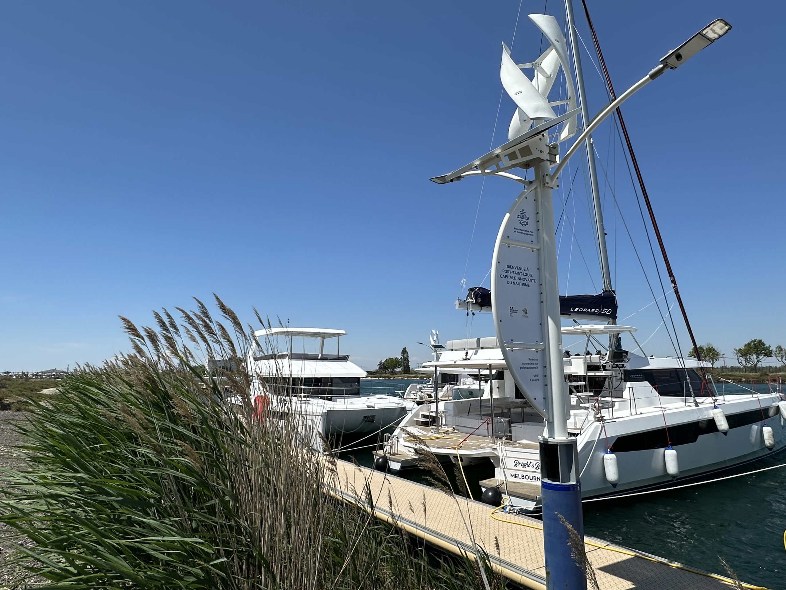 Le système repose sur une hybridation énergétique : chaque mât intègre une éolienne hélicoïdale (adaptée aux vents portuaires irréguliers) et des panneaux photovoltaïques orientés pour capter au mieux l’ensoleillement local. L’énergie produite alimente un éclairage LED basse consommation, sans aucun branchement au réseau, avec une adaptation de l’éclairage. Ce système fait partie d’un plan d’ensemble du Pôle Nautisme Mer, impulsé par le Conseil d’administration et son Directeur général, Patrice PICON, pour se projeter vers des ports 100% verts, allié durable de l’environnement. Au balcon de la Camargue, entre Rhône et Méditerranée, le Pôle Nautisme Mer a développé le premier spot multicoques du bassin méditerranéen (plus de 500 catamarans et trimarans à sec et à flot) et cette innovation prend place sur la dernière panne catamarans qui a été créée.