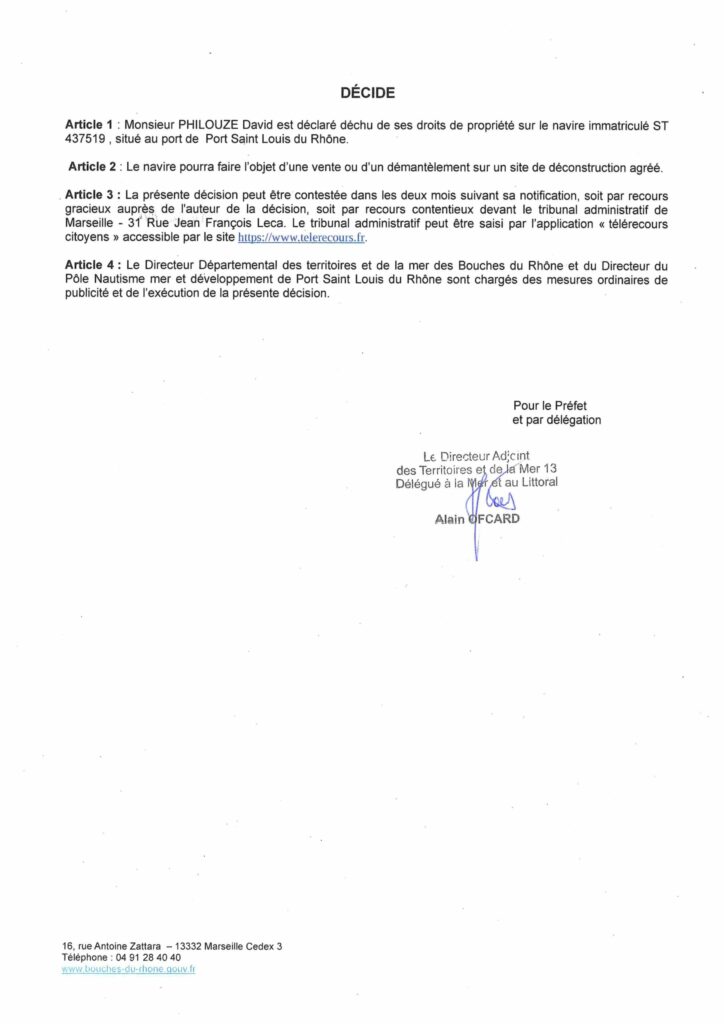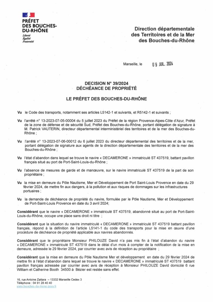 10 Juil Déchéance Voilier Decamerone Posted at 08:30h in ACTUS by Nautismed 0 Likes Share Voici l’arrêté préfectoral valant déchéance de propriété du voilier Decamerone. Pour information, merci. 39 Decheance Decamerone
