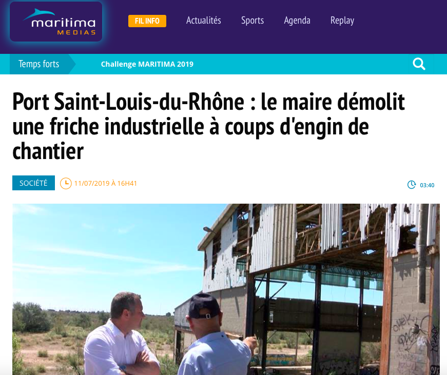 Retour sur les articles et vidéos de la presse à la suite du premier coup de pelle de la démolition des friches industrielles du Mazet donné par Martial Alvarez, Président du Pôle Nautisme, Mer & Développement, représentant Martine Vassal, Présidente de la Métropole Aix-Marseille-Provence et François Bernardini, Vice-président de la Métropole AMP et Président du Conseil de territoire Istres-Ouest Provence, jeudi 11 juillet 2019.