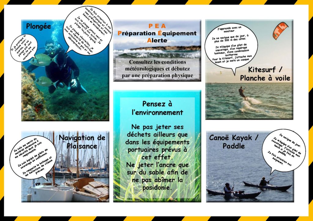 Outre les risques, cette campagne rappelle aussi qu’il est important de prendre soin de la mer et de son environnement : je ne jette pas mes déchets en mer ou sur le littoral, je ne jette pas l’ancre au milieu d’un herbier de posidonie.
