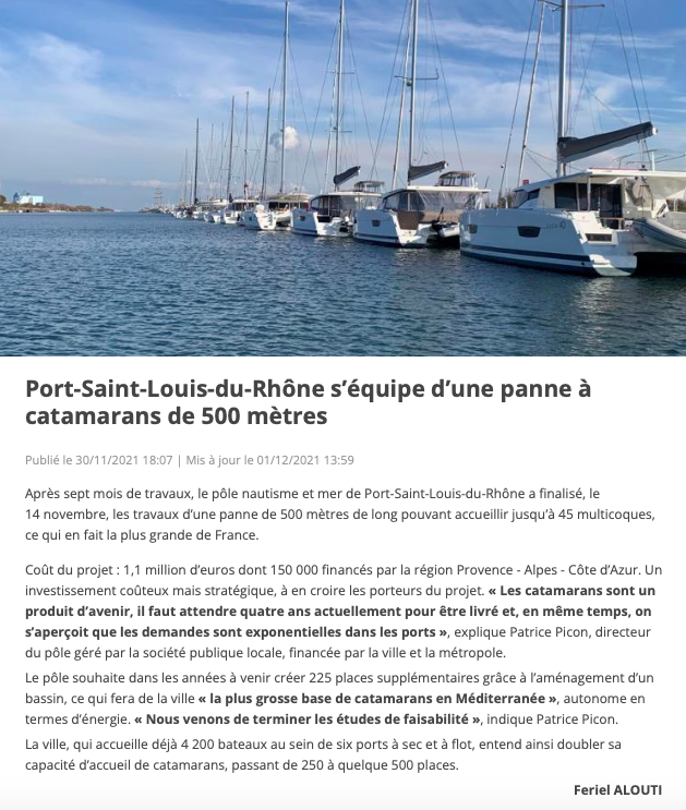01 Déc Le Marin met le cap sur la Panne catamarans Posted at 15:52h in ACTUS by Nautismed 0 Likes Share Le media spécialisé Le marin consacre un article sur son site internet, en évoquant l’aménagement dédié aux multicoques réalisé par le Pôle Nautisme, Mer & Développement, présidé par Martial ALVAREZ.