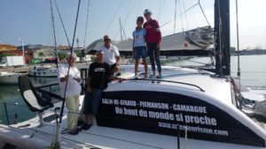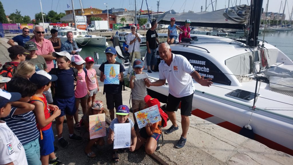 Dans ce cadre, l’école élémentaire du Sambuc grâce à son directeur Philippe Martinez, participe à cette aventure. Le 15 juin dernier, Jean-Pierre Balmès, et l’association des clowns à l’hôpital sont venus à l’école du Sambuc pour rencontrer les enfants, échanger et partager autour du bateau et de la Route du Rhum. Par la suite, les enfants de l’école du Sambuc ont réalisé une collecte afin de remettre un chèque de soutien à l’association Rire. En remerciement pour leur geste, Jean-Pierre Balmès a décidé de leur présenter le bateau grandeur nature ce jeudi 5 juillet. Une occasion unique pour les enfants de découvrir, au coeur du port de plaisance de Port-Saint-Louis, un catamaran. Et de lui donner du souffle pour porter haut les couleurs de la Camargue à l’occasion des 40 ans de la mythique Route du rhum.